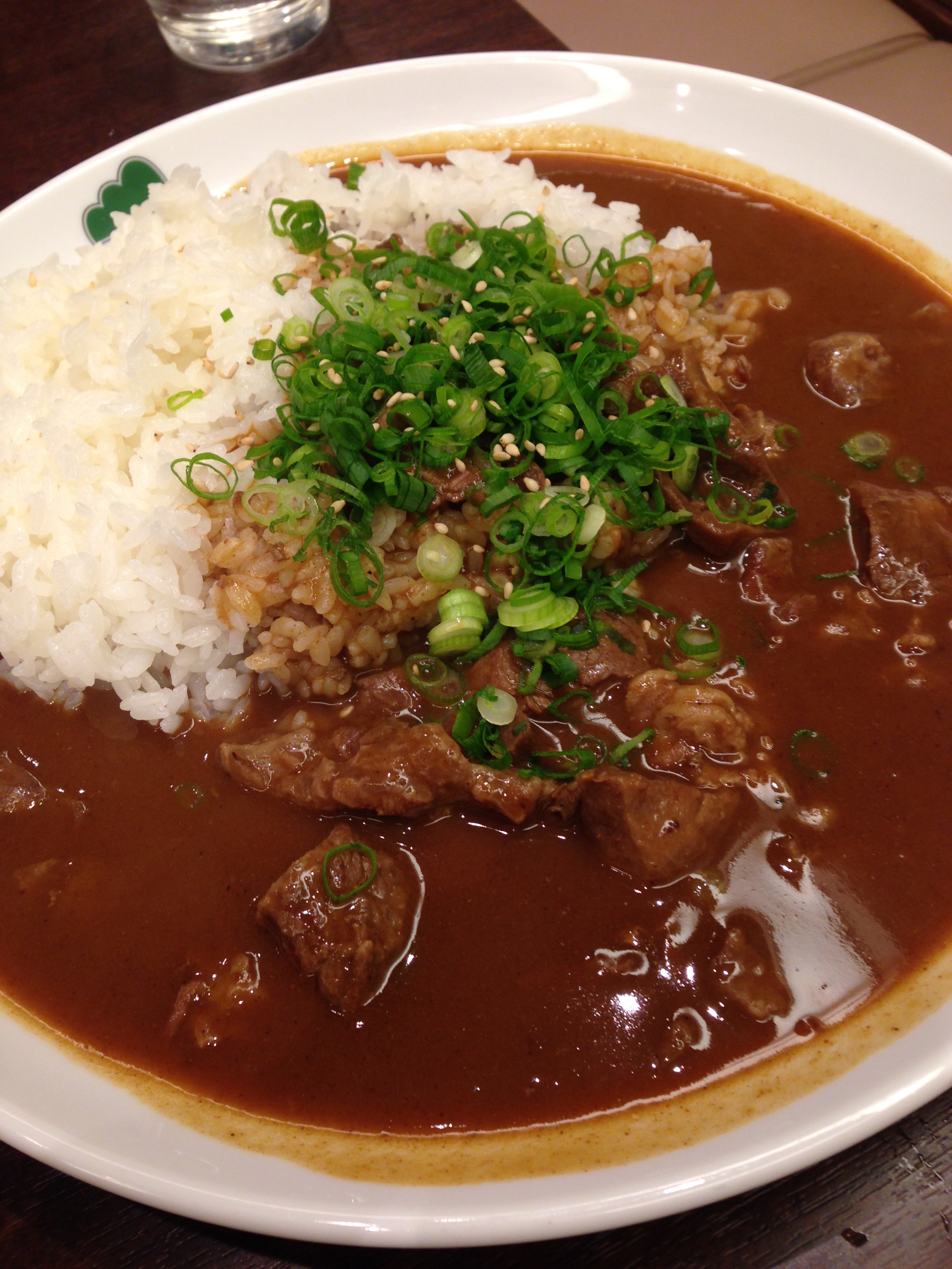 連れが注文した牛すじカレー。青ねぎがボーンで乗せられとって、見た目はけっこうヘルシーや。牛すじも柔らかそうやな。一口もらお思とったら我のに夢中で忘れとった。もったないことしたわ~! 味は実際食べて確認してみてや!