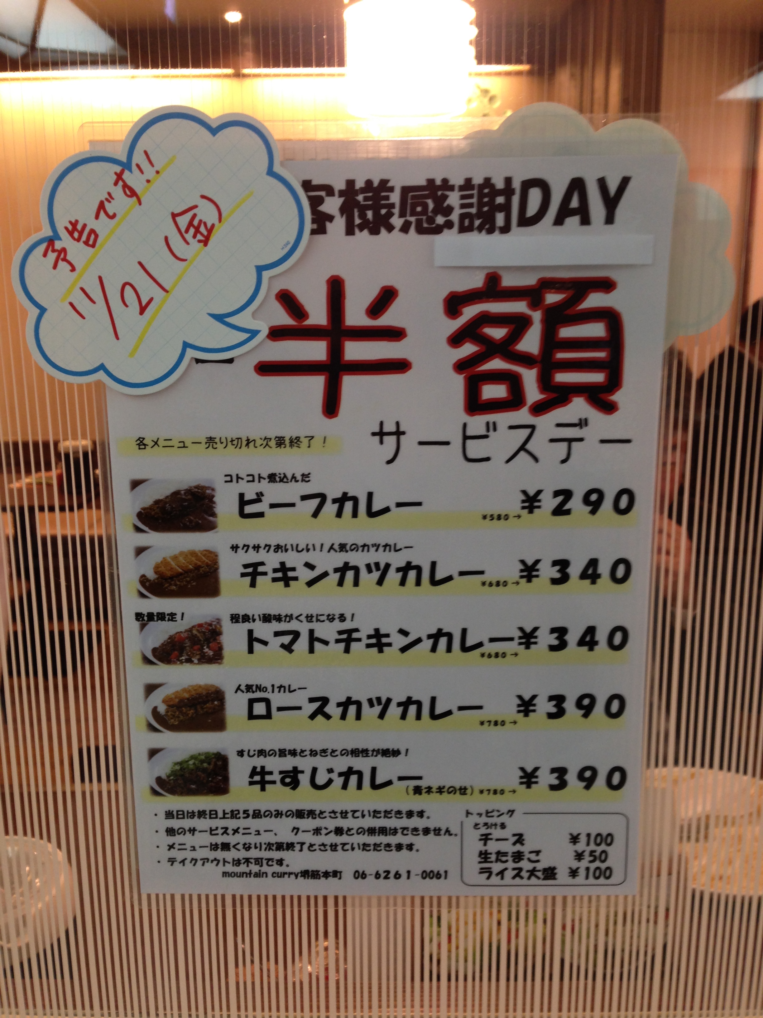 こないだ、連れからこの日に昼飯食べに行きまひょ~言うて誘われた店があってん。それが本町の船場センタービル3号館にあるこの店、「マウンテンカレー」さん。なんときょう11月21日、お客様感謝デーとやらで半額やったんや。たまにはええネタ拾てくるやんけあいつ。