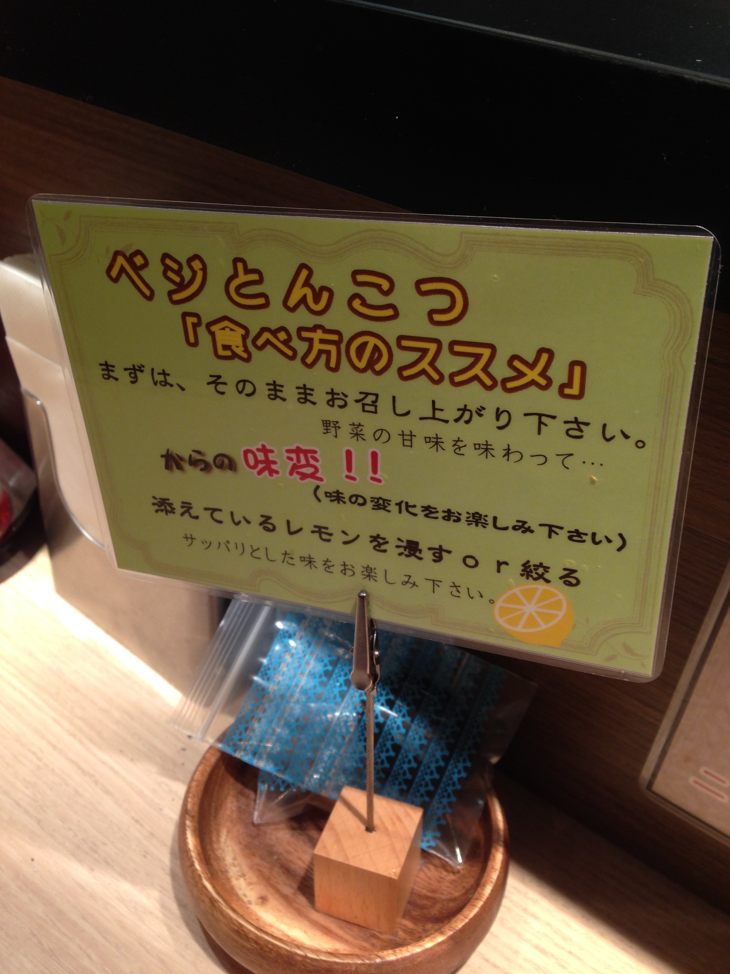 オリジナルメニュー「ベジとんこつ」の美味しい食べ方のPOPなどもあった。