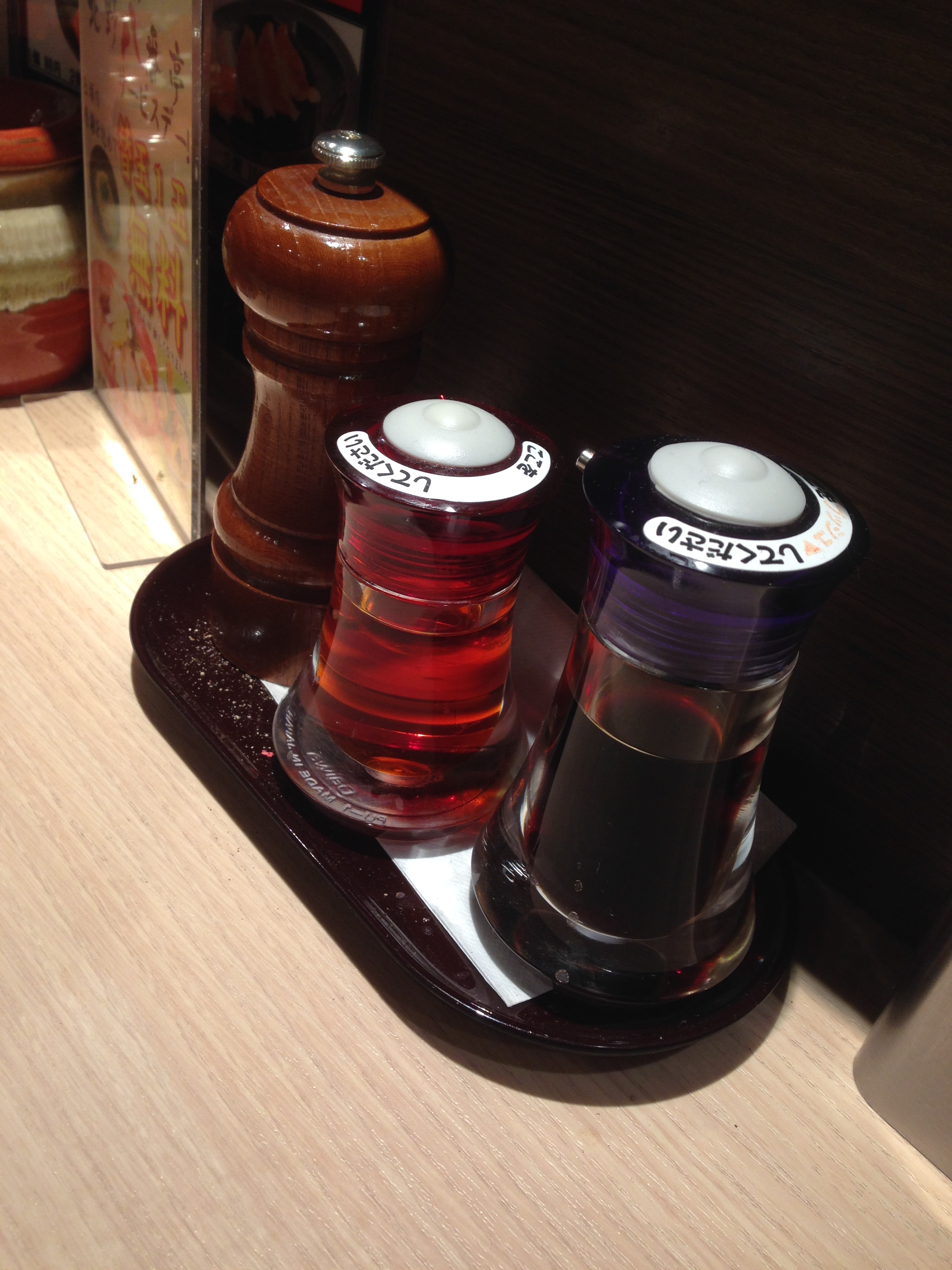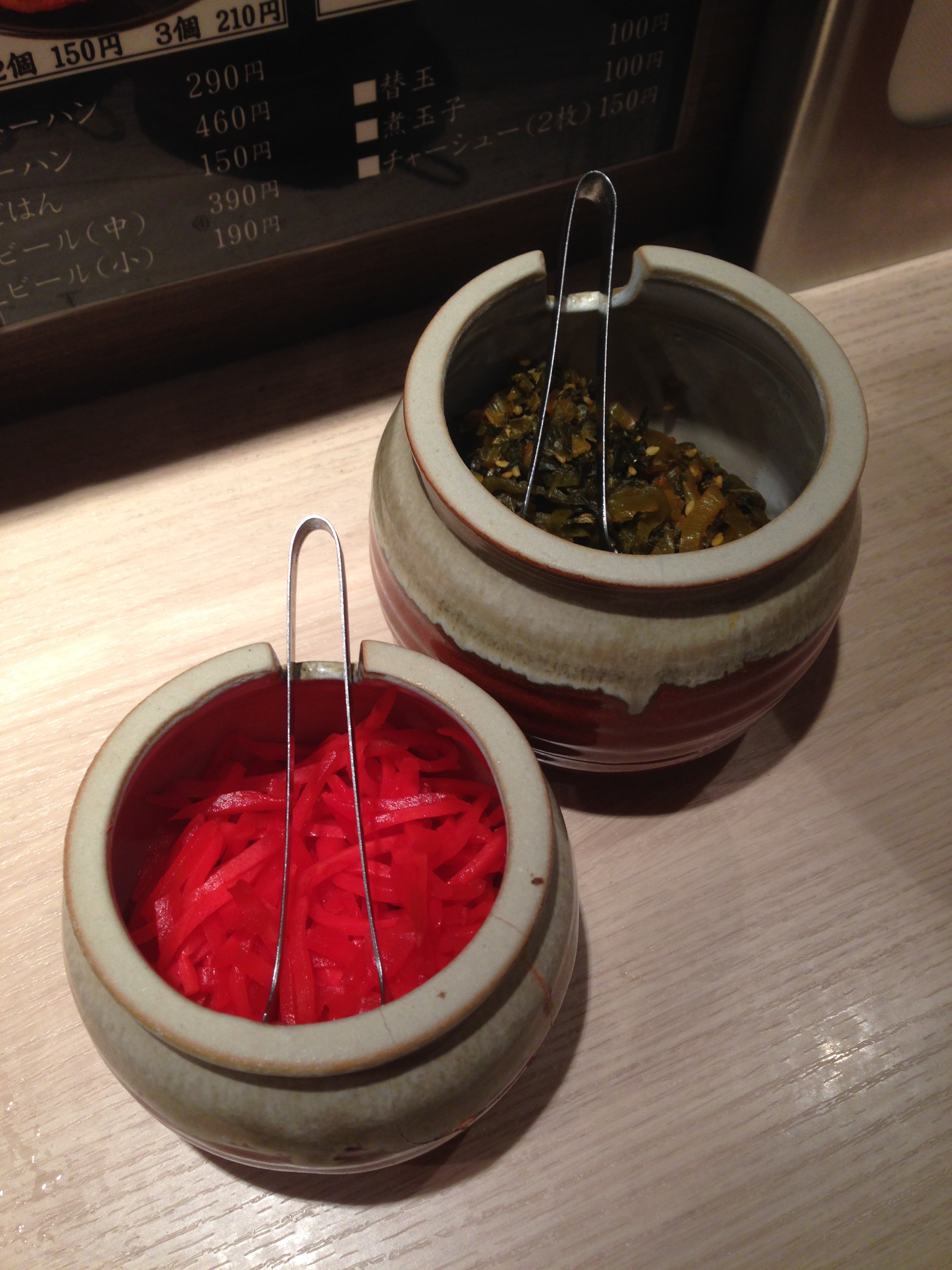 カウンターに座り、卓上をチェック。餃子のタレなどの各種調味料の他に、壺に入った辛子高菜・紅しょうがもある。九州系とんこつラーメンには欠かせないトッピングだ。