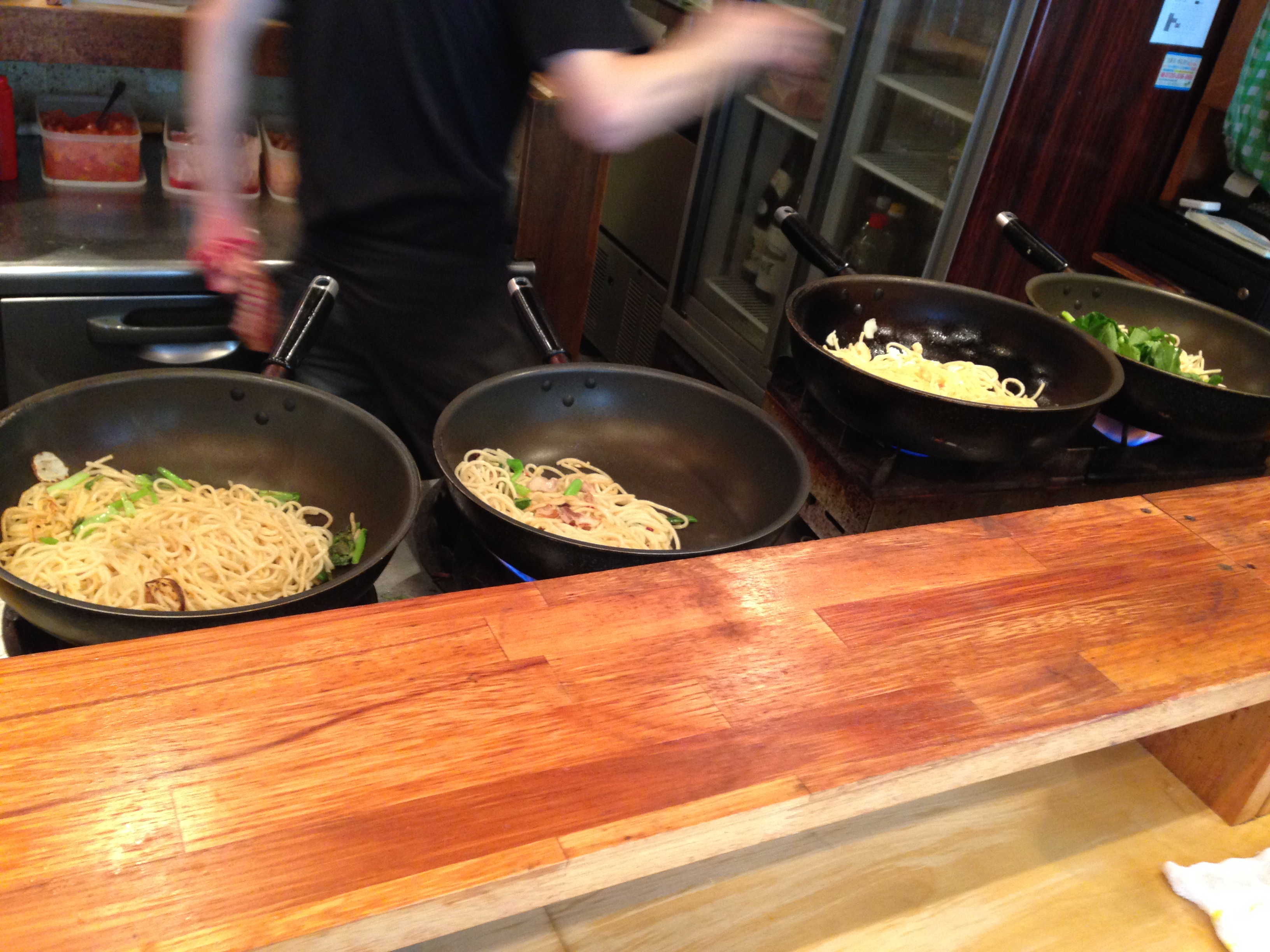 業務用コンロ4台を同時に使用したフライパンリレーで、次々に調理されていく様は圧巻。