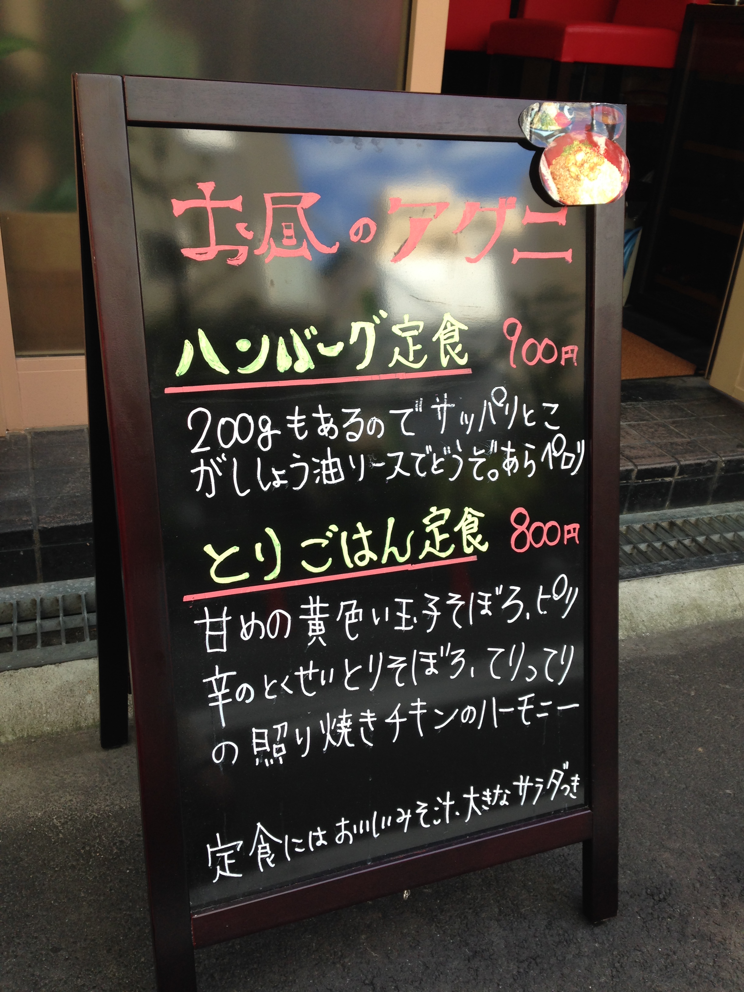 タネからソースまで完全オリジナルの手作りハンバーグ定食と、そぼろと鶏照り焼き・玉子を載せたとりごはん定食を提供している。それぞれ、キャベツの千切りに大根おろしと紅しょうがを乗せ、ポン酢系ドレッシングをかけた大きなサラダ付き。
