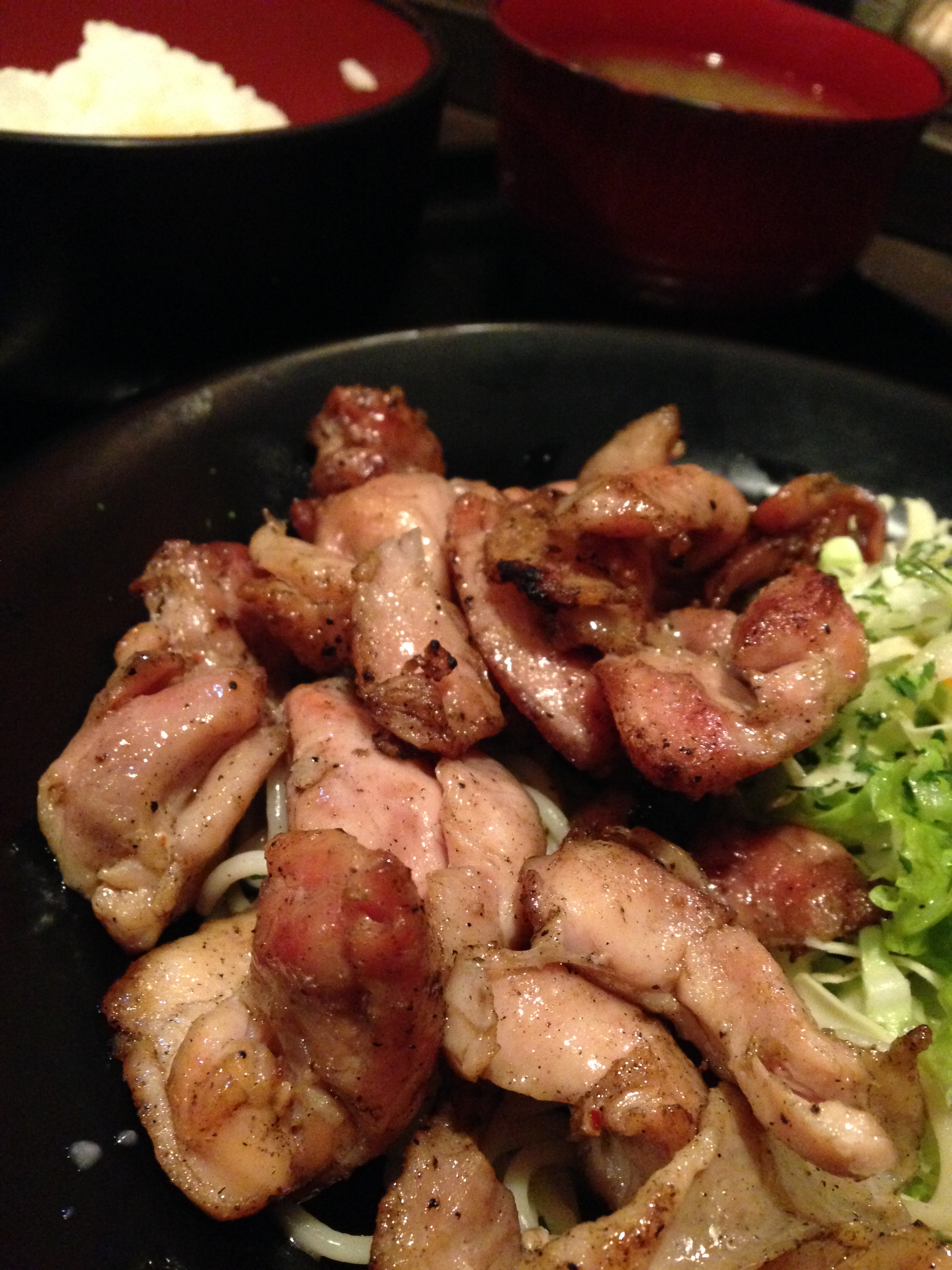 もも炭焼、ごはん、味噌汁、付け合せサラダのセット。