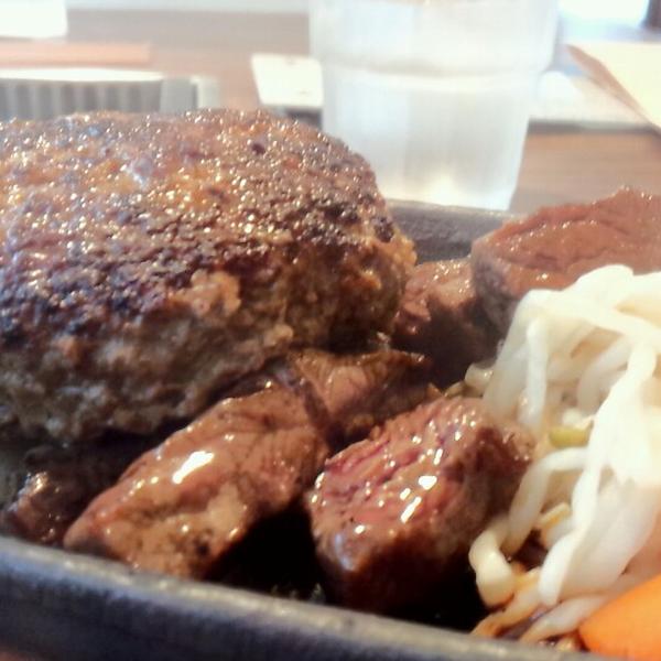 ハンバーグ(200g)・ステーキ(70g)・ライス・スープ・日替り小鉢二種・サラダ・コーヒー