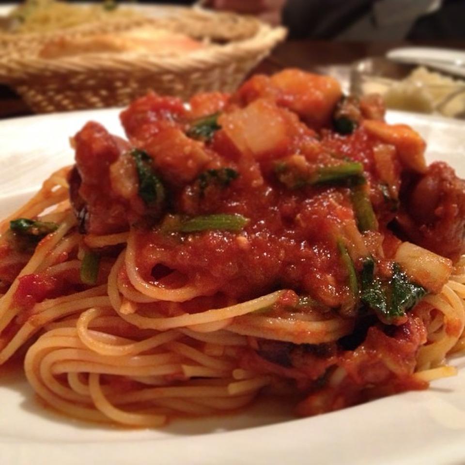 ツナ、ほうれん草、米ナス、かぼちゃのスパゲッティ(トマトソース)