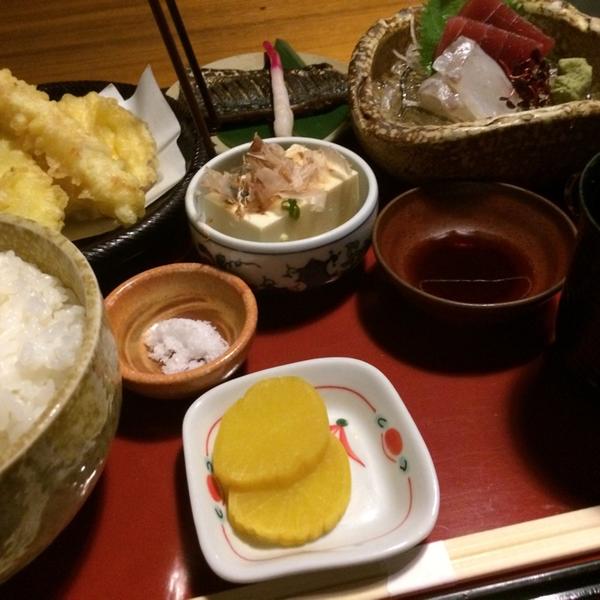 (刺身・天麩羅・焼魚・山芋とろろ・御飯・漬物・味噌汁)