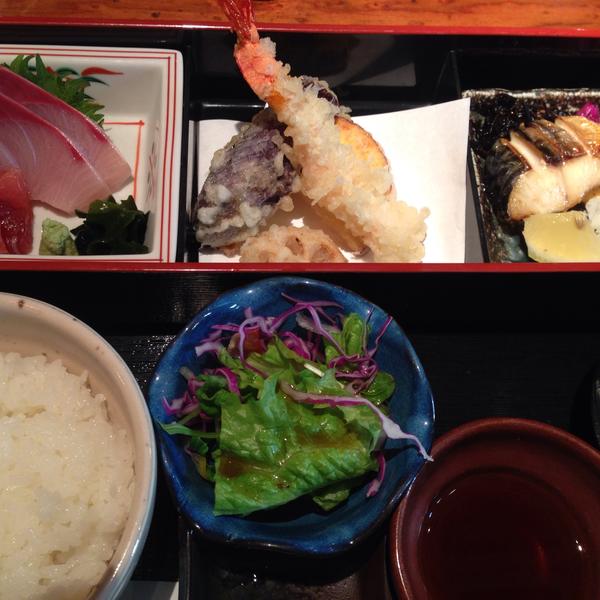 刺身・天ぷら(えび・さつまいも・れんこん・なす他6種前後)・焼き魚・ご飯(大盛り無料)・サラダ・お味噌汁