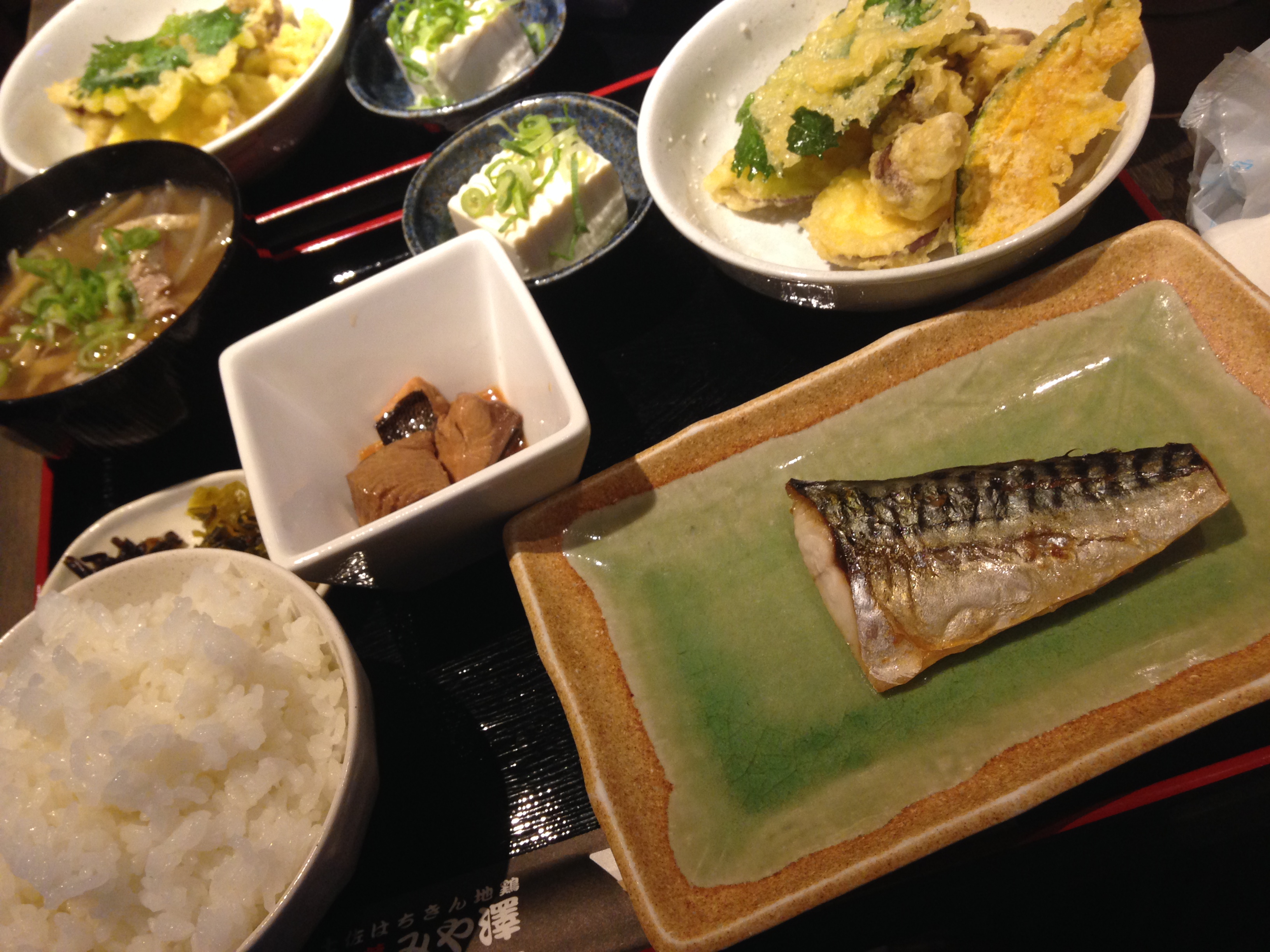 鯖の塩焼き、野菜天ぷら(大葉、しめじ、さつま芋)、豚汁、冷奴、お新香、魚の煮物、ごはん(写真は普通盛り)