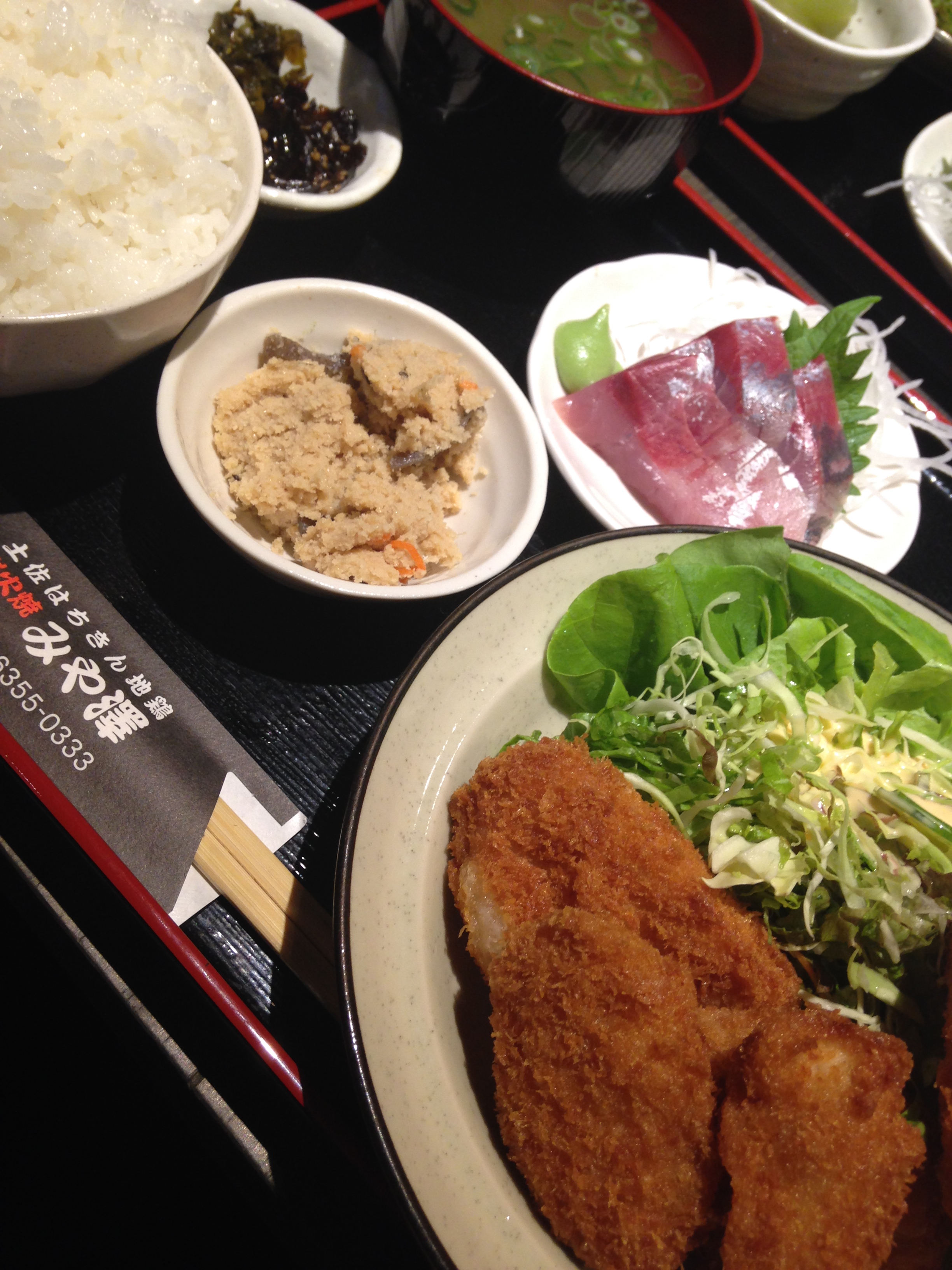 天然ハマチの造り、チキンカツ、炊いたふき、卯の花、漬物