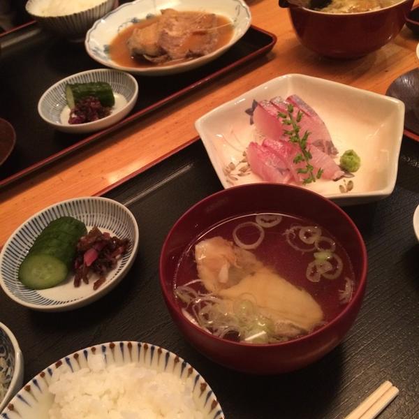 (煮物、ご飯、味噌汁、お漬物、季節の果物)