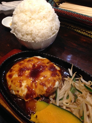 ハンバーグは、つなぎが少なめで肉感溢れるジューシー仕様。具材のたまねぎのカットも大きめで、シャキシャキした食感が残っておりグッド。良い意味で、家庭のハンバーグを彷彿とさせる一品。