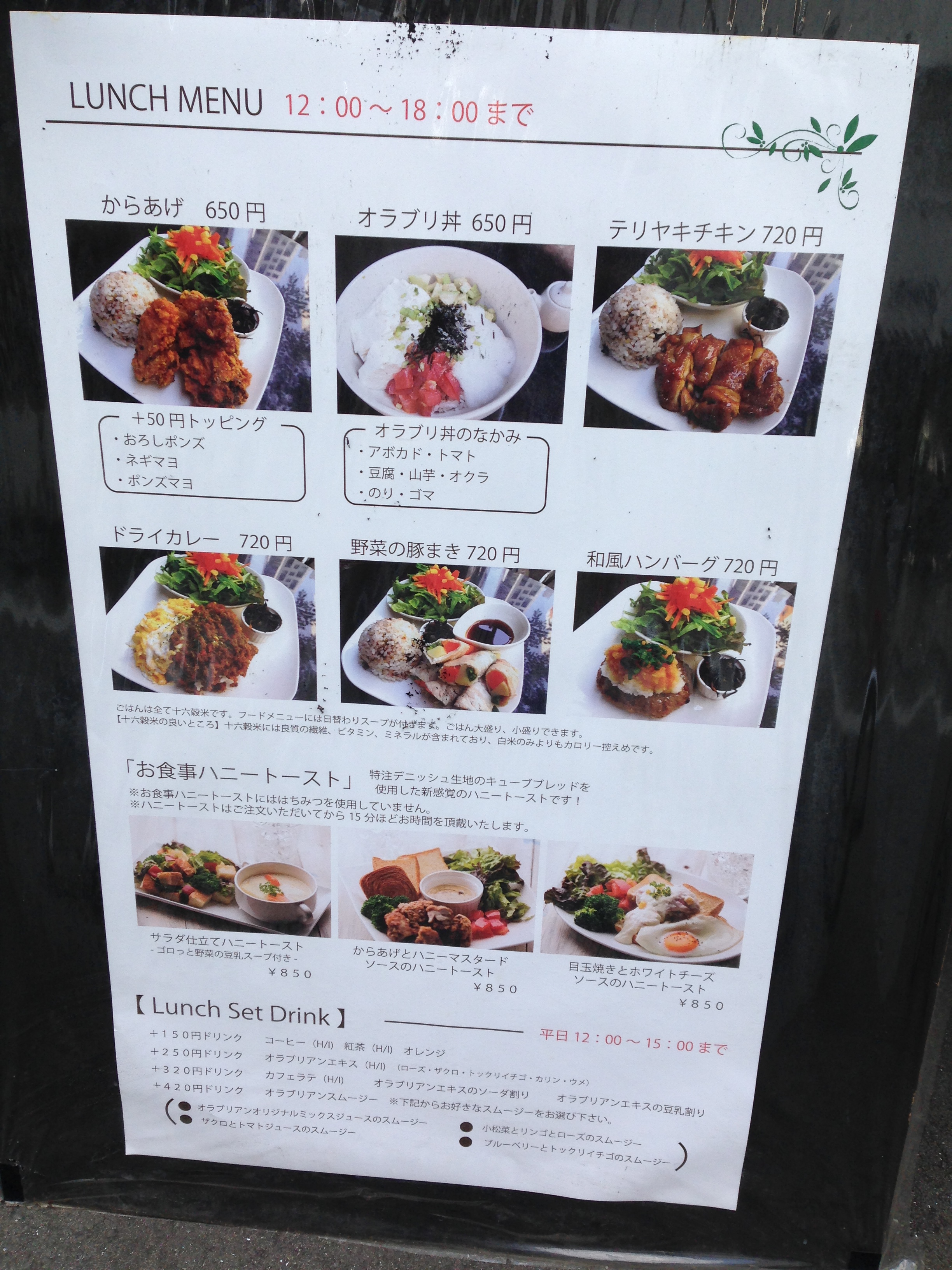 ・十六穀米メニュー(日替わりスープ、サラダ、小鉢付き。オラブリ丼はスープのみ)