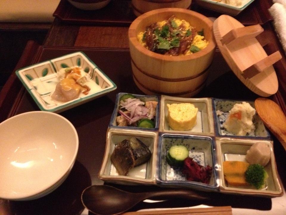 (刺身五点盛り・鮪の山かけ・煮物・豆富あんかけ・御飯・赤出汁・香の物)