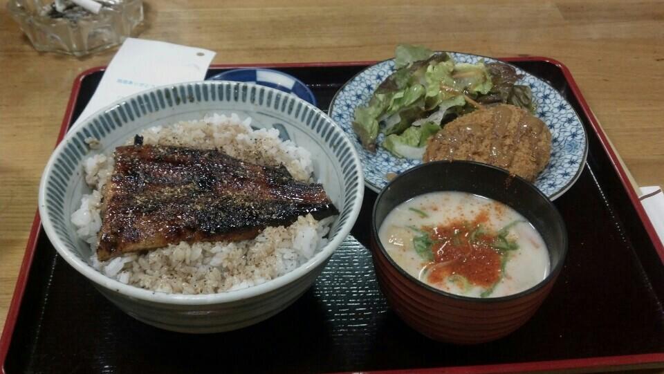 (ウナギ丼、コロッケ、サラダ、漬物、味噌汁)