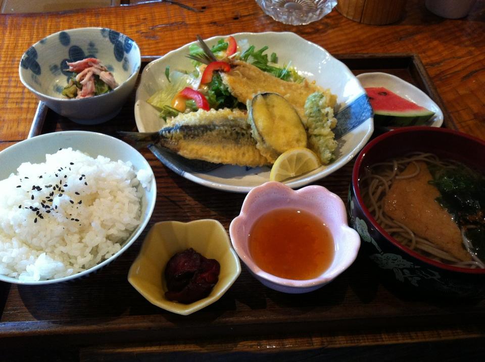 (お造り三種・炊合せ・小鉢・天婦羅盛・じゃこご飯・香物・味噌汁・フルーツ)